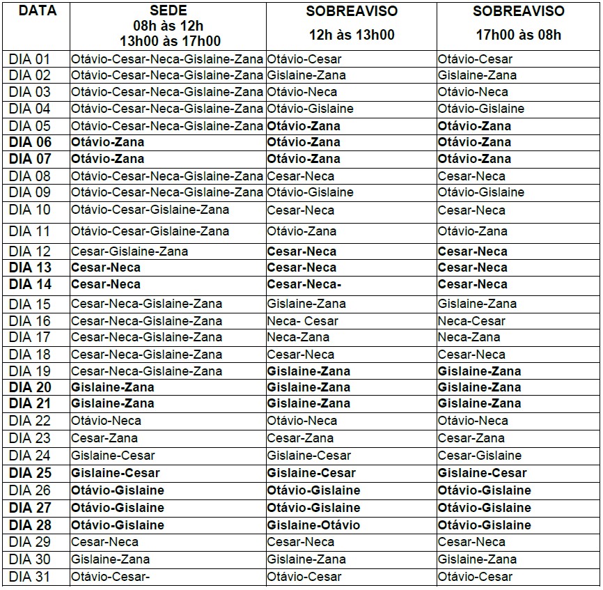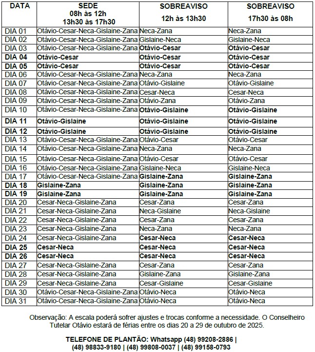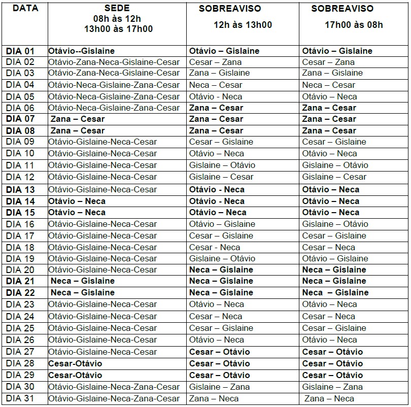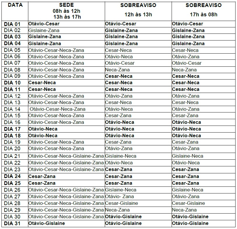 Observação: A escala poderá sofrer ajustes e trocas conforme a necessidade.